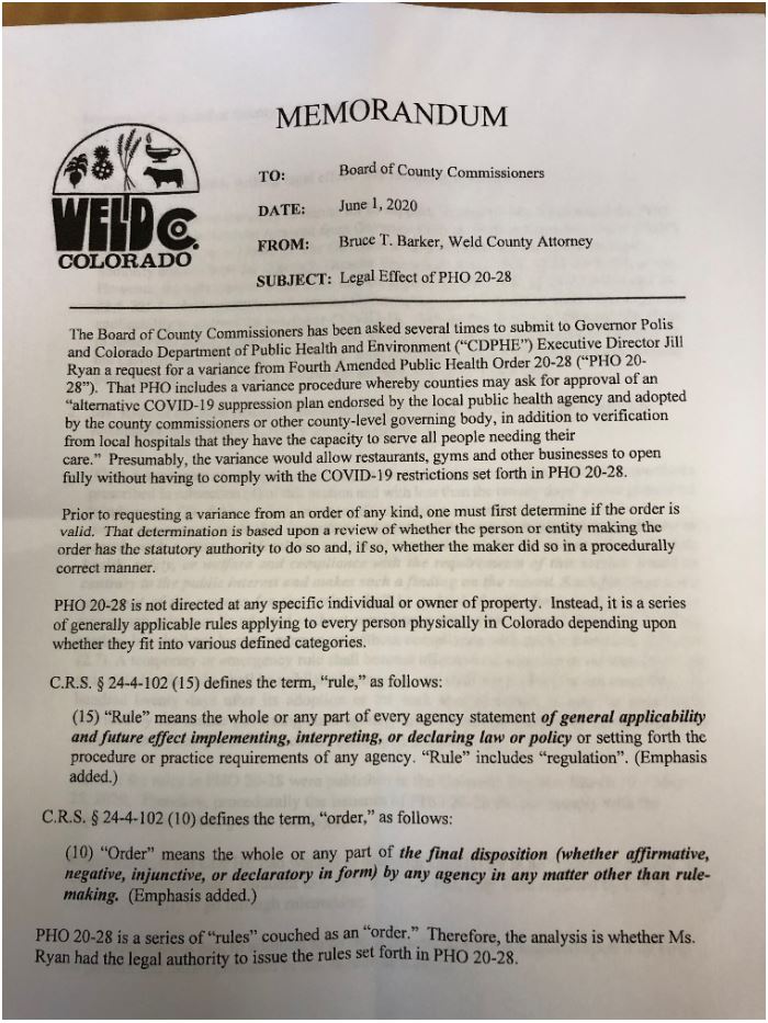 The mandates have “no legal effect,” according to the Weld County Attorney Bruce Barker. (See page three of the Attorney's Memorandum at the bottom of this page.)